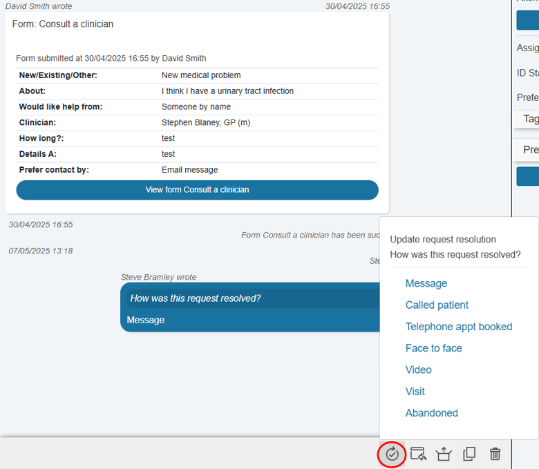 If for any reason you need to update the recorded resolution method (or 'completed on behalf of') after a request has been completed, you can use the 'Update resolution method' button to do so, without needing to re-open the request and avoiding notifying the patient when it is closed again.